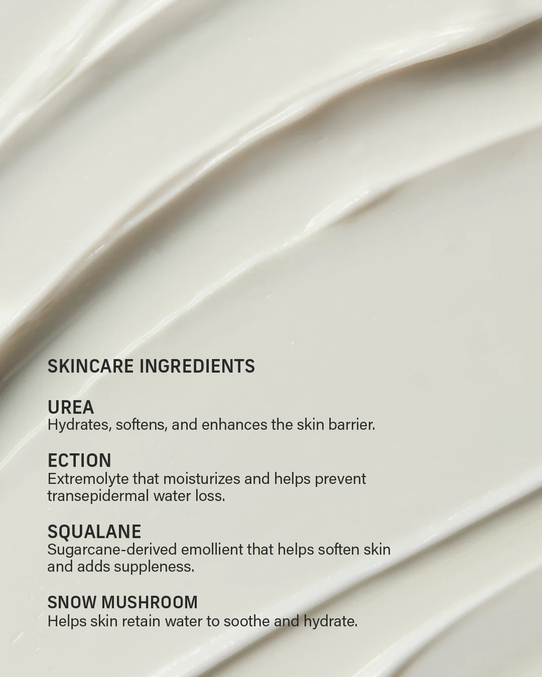 UREA Hydrates, softens, and enhances skin barrier function.